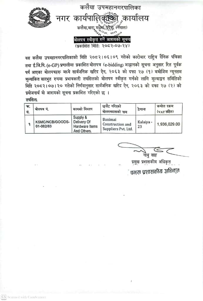 बोलपत्र स्वीकृत गर्ने आशयको सूचना-मितिः२०८२।०७।२४