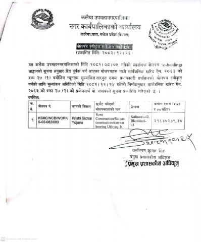 बोलपत्र स्वीकृत गर्ने आशयको सूचना - मितिः२०८२।०९।२५