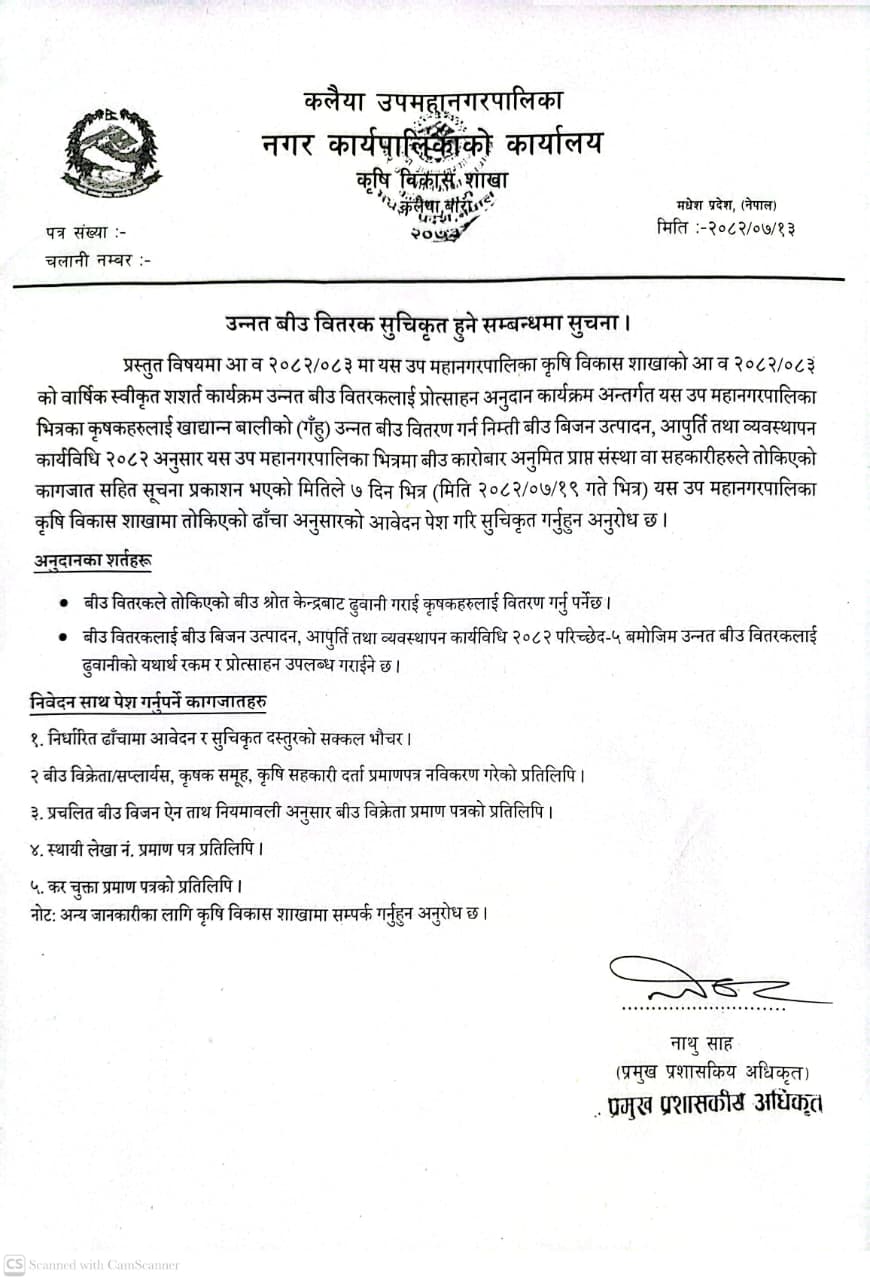 उन्नत बीउ वितरक सुचिकृत हुने सम्बन्धी सूचना-मितिः२०८२।०७।१३