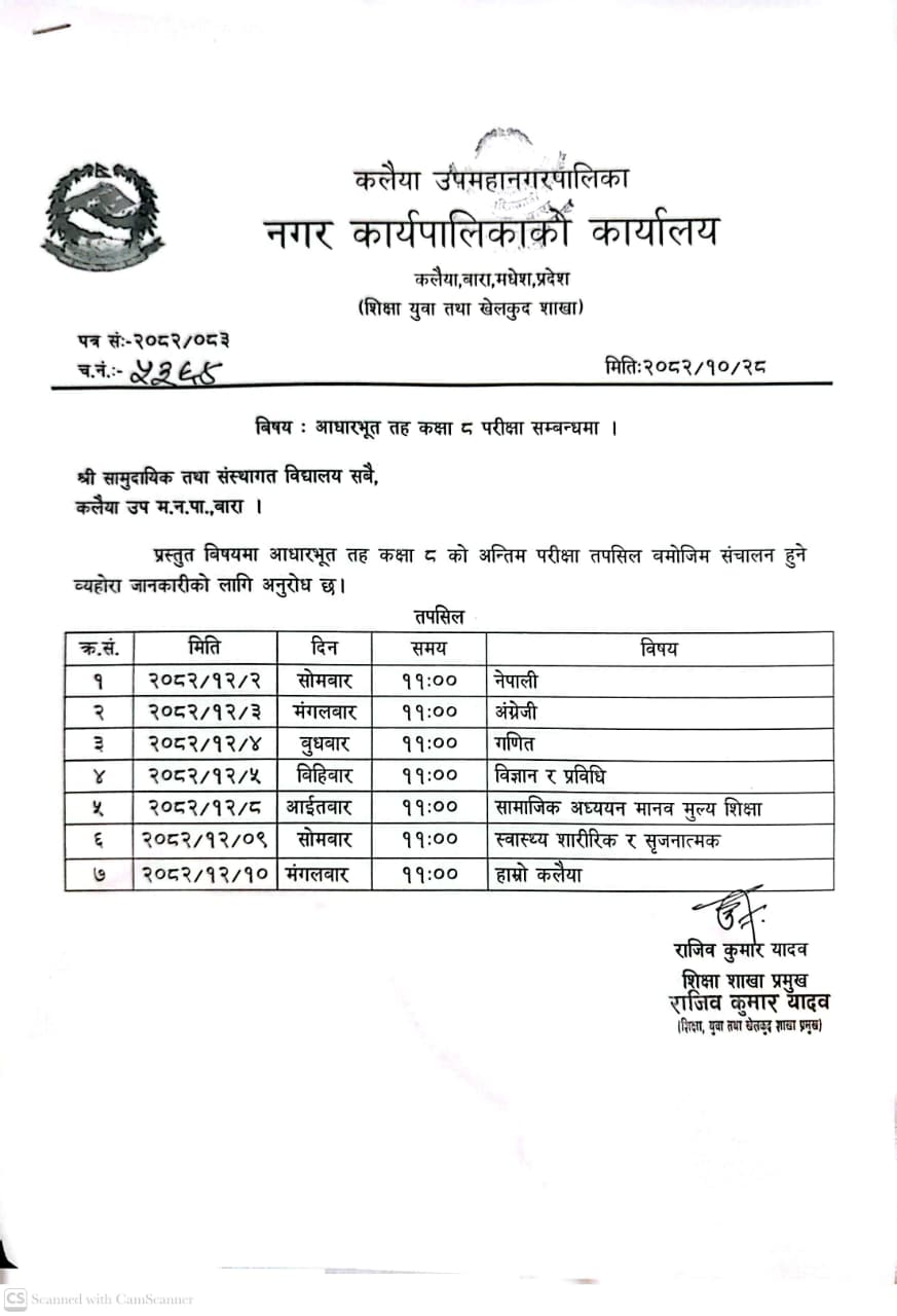 कक्षा ८ को परीक्षा आवेदन फाराम भर्ने भराउने सम्बन्धी सूचना-मितिः२०८२।०९।२१
