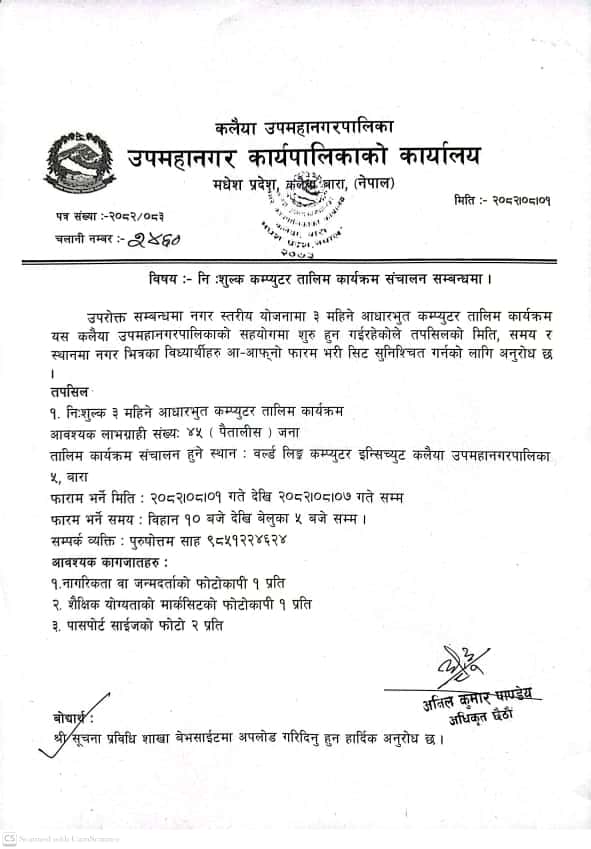 नि:शुल्क कम्प्युटर तालिम संचालन सम्बन्धी सूचना-मितिः२०८२।०७।२८