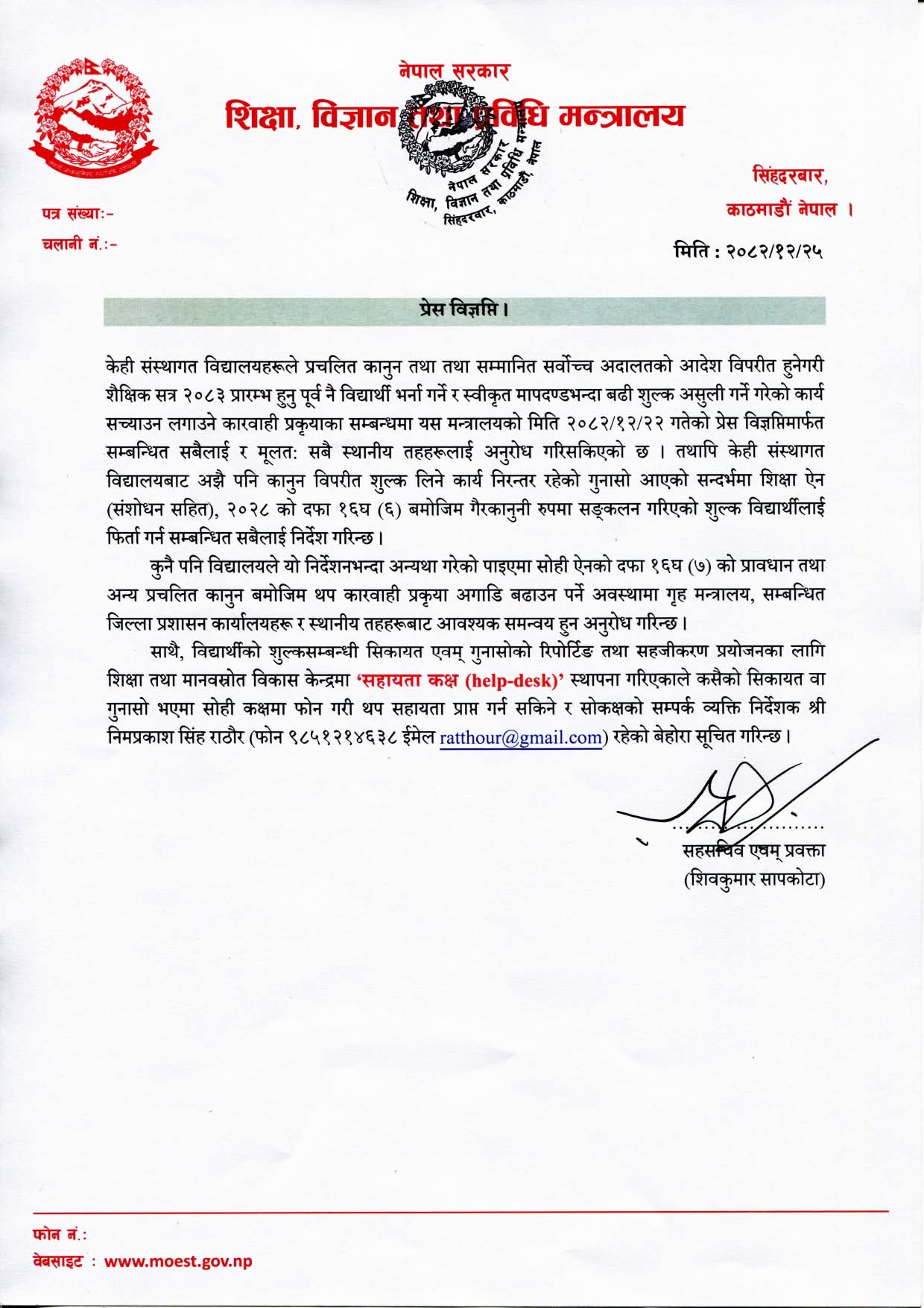 विद्यार्थी भर्ना तथा शुल्क नलिने जानकारीको लागि सूचना-मितिः२०८२।१२।२५