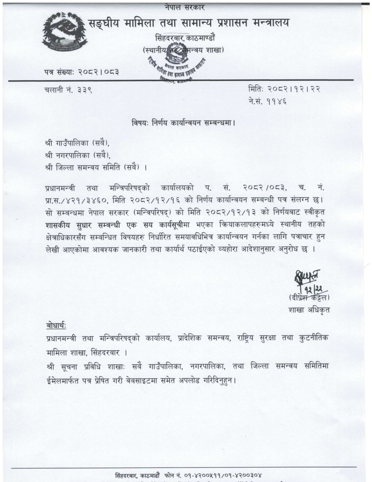 नेपाल सरकार, मन्त्रिपरिषद्को मिति २०८२ चैत्र १३ को बैठकबाट स्वीकृत शासकीय सुधार सम्बन्धी एक सय कार्यसूचीहरु मध्ये आफ्नो क्षेत्र भित्र पर्ने निर्णय कार्यान्वयन सम्बन्धी सूचना - मितिः२०८२।१२।२२