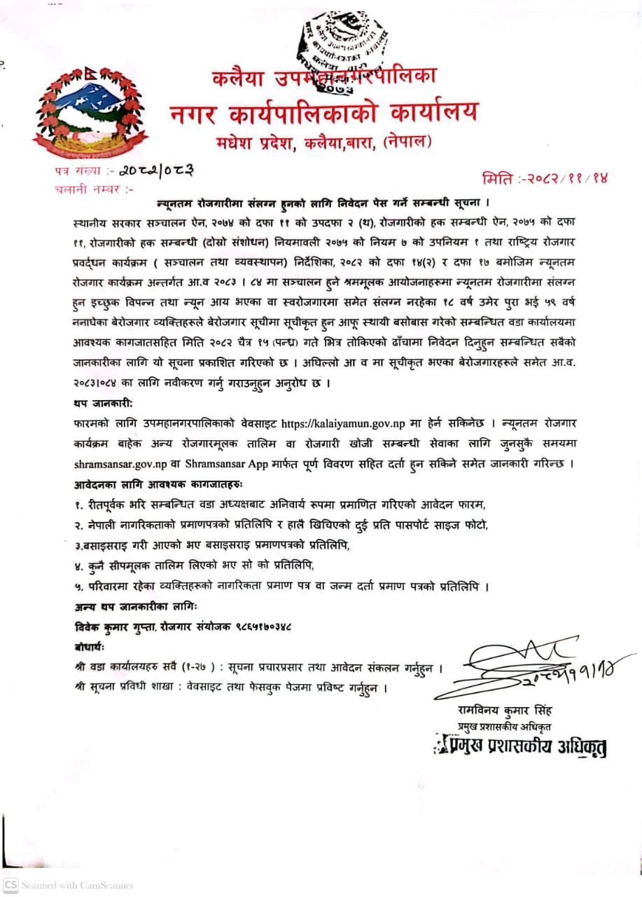 न्यून्तम रोजगारीमा संलग्न हुनको लागि निवेदन पेश गर्ने सम्बन्धी सूचना-मितिः२०८२।११।१४