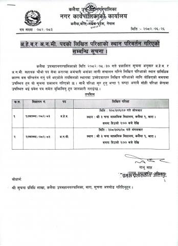 अ.हे.व. र अ.न.मि. पदको लिखित परीक्षाको स्थान परिवर्तन सम्बन्धी सूचना-मितिः२०८२।०६।२६