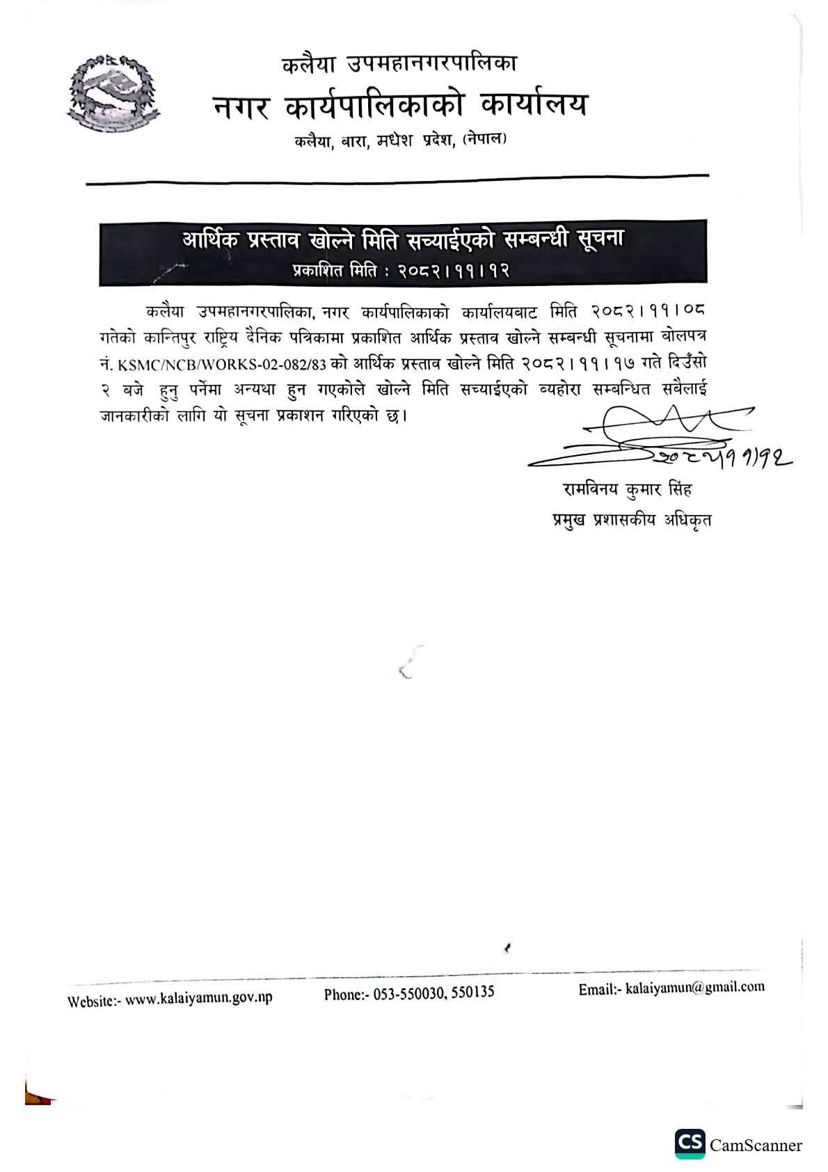 बोलपत्र संसोधन सम्बन्धी सूचना - मितिः२०८२।०९।०४