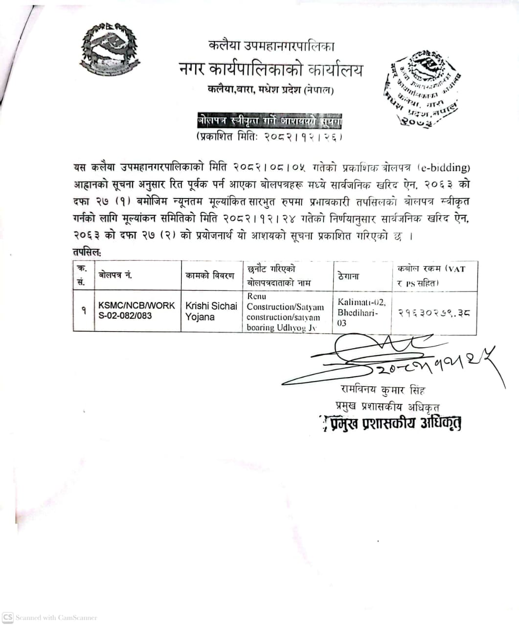 बोलपत्र स्वीकृत गर्ने आशयको सूचना - मितिः२०८२।०९।२५