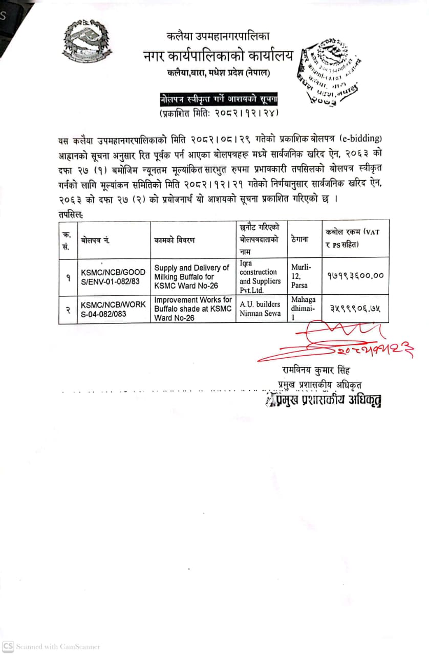 बोलपत्र स्वीकृत गर्ने आशयको सूचना - मितिः२०८२।१२।२४