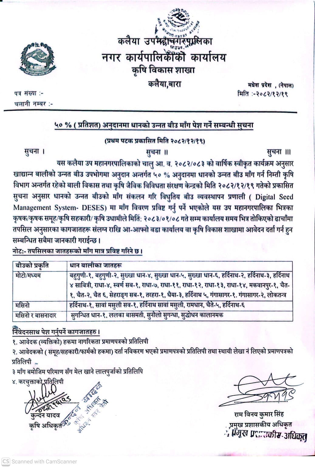 ५०%(प्रतिशत) अनुदानमा धानको उन्नत बीउ माँग पेश गर्ने सम्बन्धी सूचना-मितिः२०८२।१२।१९