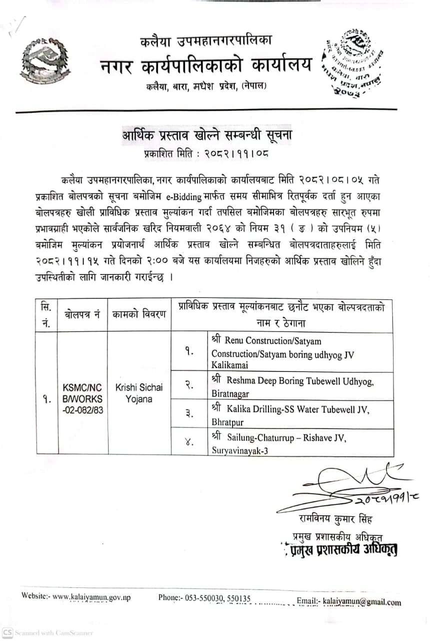 आर्थिक प्रस्ताव खोल्ने सम्बन्धी सूचना - प्रकाशित मिति : २०८२।११।०८