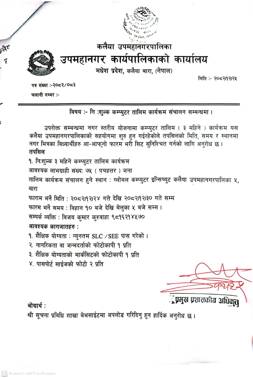 निःशुल्क कम्प्युटर तालिम कार्यक्रम संचालन सम्बन्धी सूचना – मितिः२०८२।१२।२४
