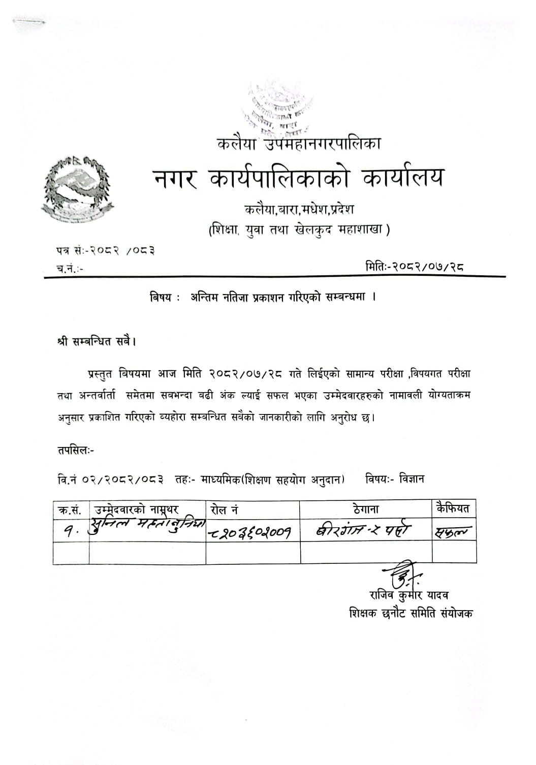 परीक्षाको अन्तिम नतीजा प्रकाशन सम्बन्धी सूचना-मितिः२०८२।०७।२८