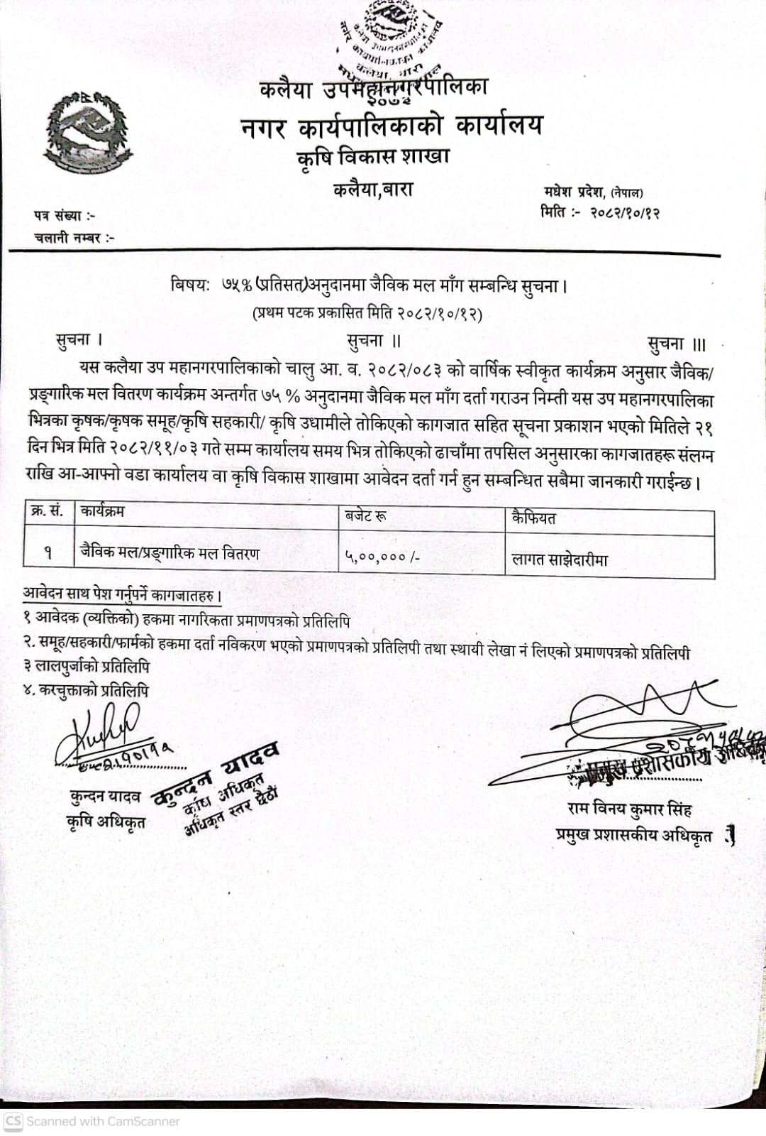 ७५% अनुदानमा जैविक मल माग सम्बन्धी सूचना-मितिः२०८२।१०।१२