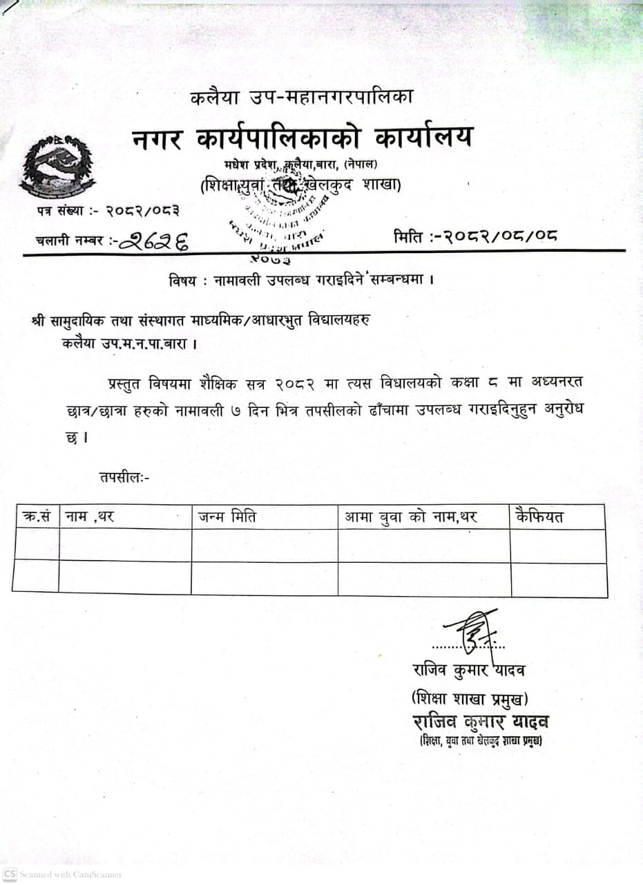विद्यालयहरुले नामावली उपलब्ध गराईदिने सम्बन्धी सूचना-मितिः२०८२।०८।०८