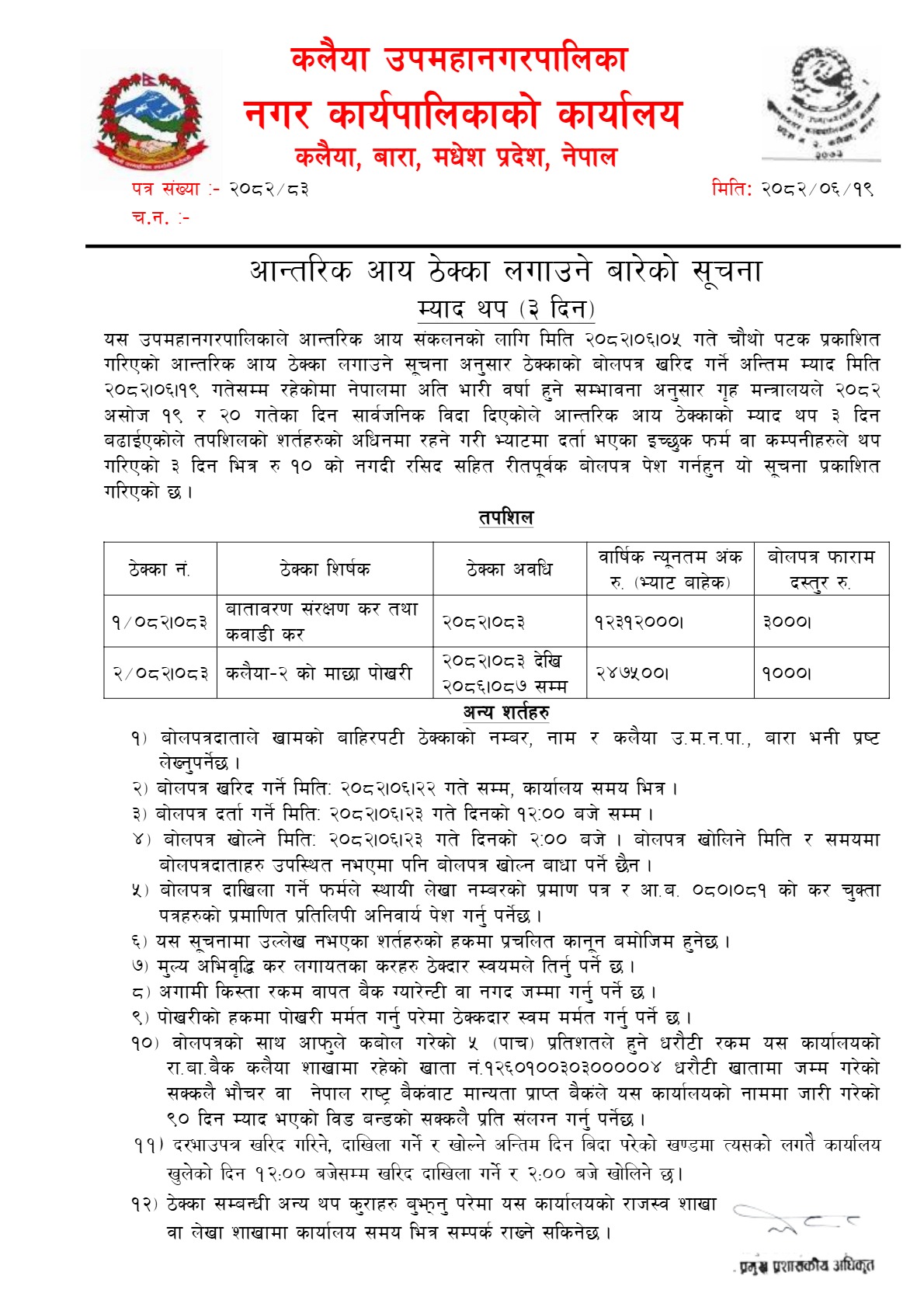 आन्तरिक आय ठेक्का लगाउने सूचनाको म्याद थप गरिएको सूचना-मितिः२०८२।०६।१९
